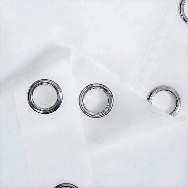 Het gordijn is klaar met metalen ringen, van hoogwaardig voile-materiaal , op een witte ondergrond met een natuurlijke uitstraling.