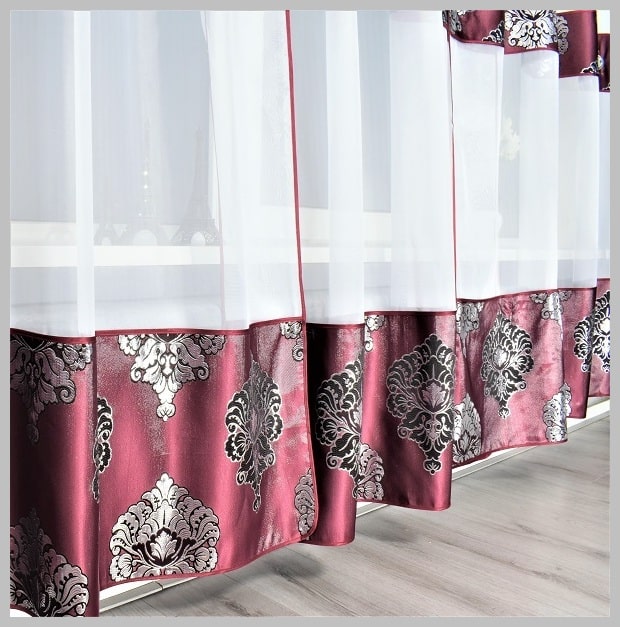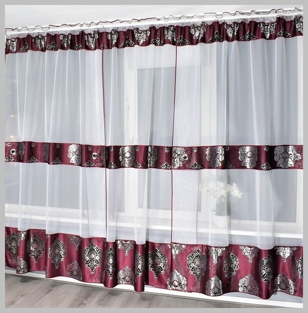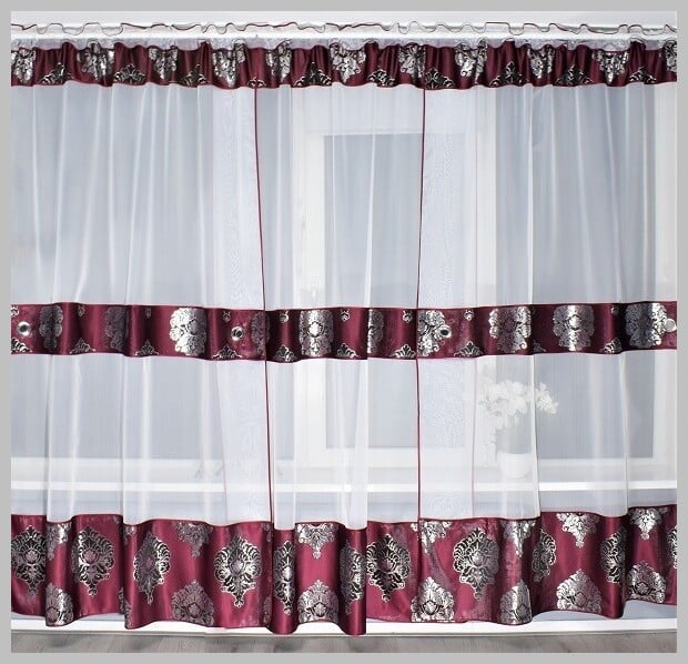 Dit is een prachtig kant en klaar vitrage met bordo rode kleur decoratie design.